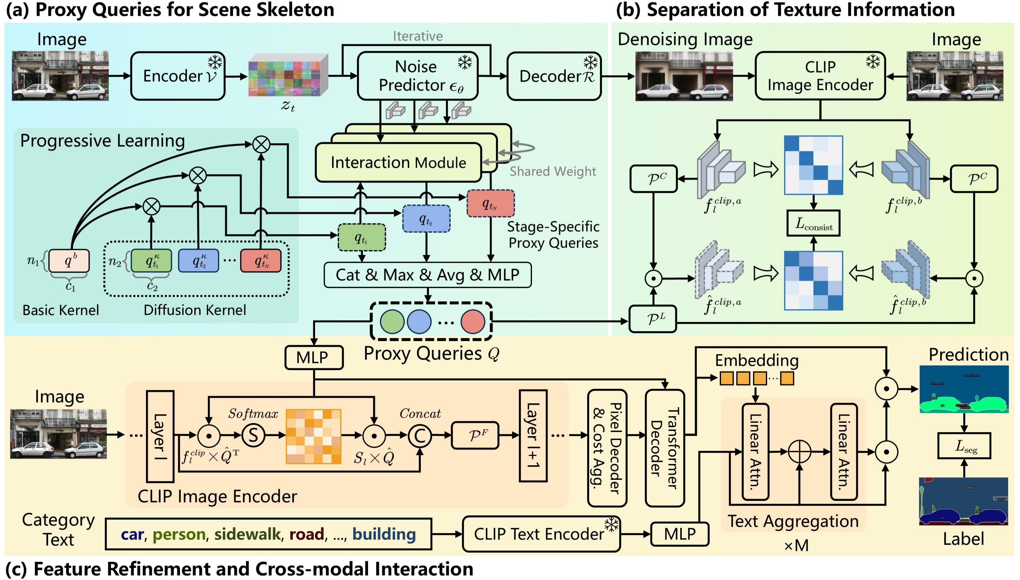 A brief illustration of our proposed framework. Our method introduces learnable proxy queries to progressively construct the scene skeleton during the denoising process of the diffusion model. Next, we leverage the robustness of CLIP’s visual features to texture shifts to disentangle the diffusion feature space. Finally, we enhance the scene perception within CLIP features using optimized proxy queries, which also serve as an interface to facilitate multi-level interactions between textual and visual modalities.