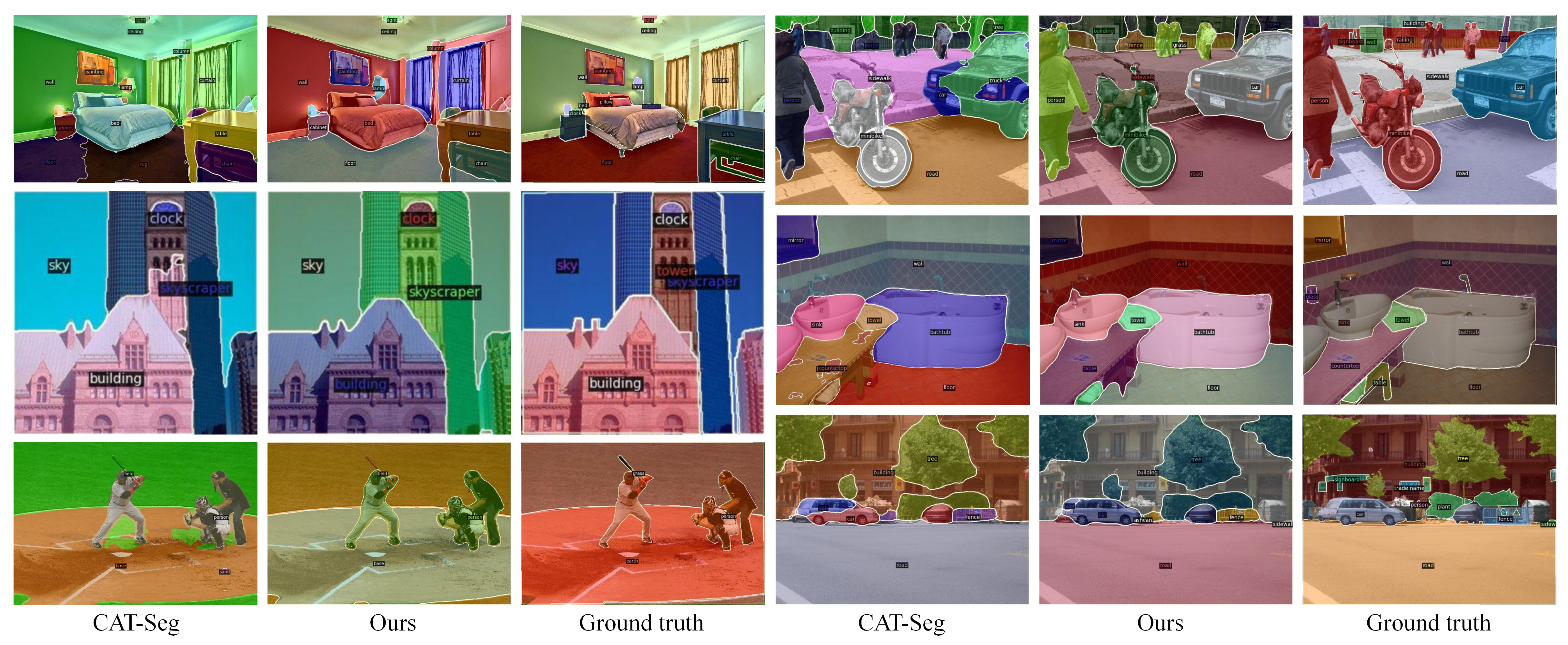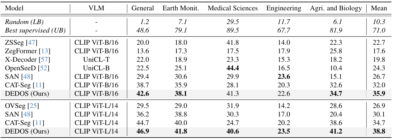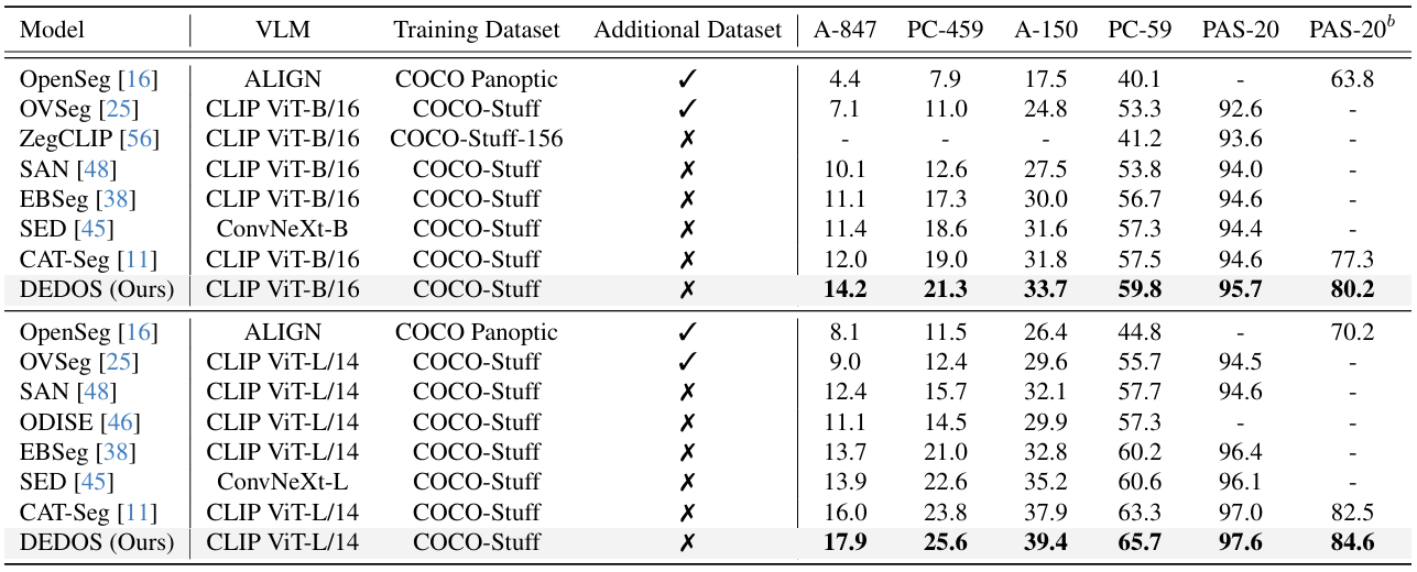 Qualitative results on ADE20K validation sets. DEDOS demonstrates more accurate category predictions and more complete spatial distributions. The supplement contains more visual results.