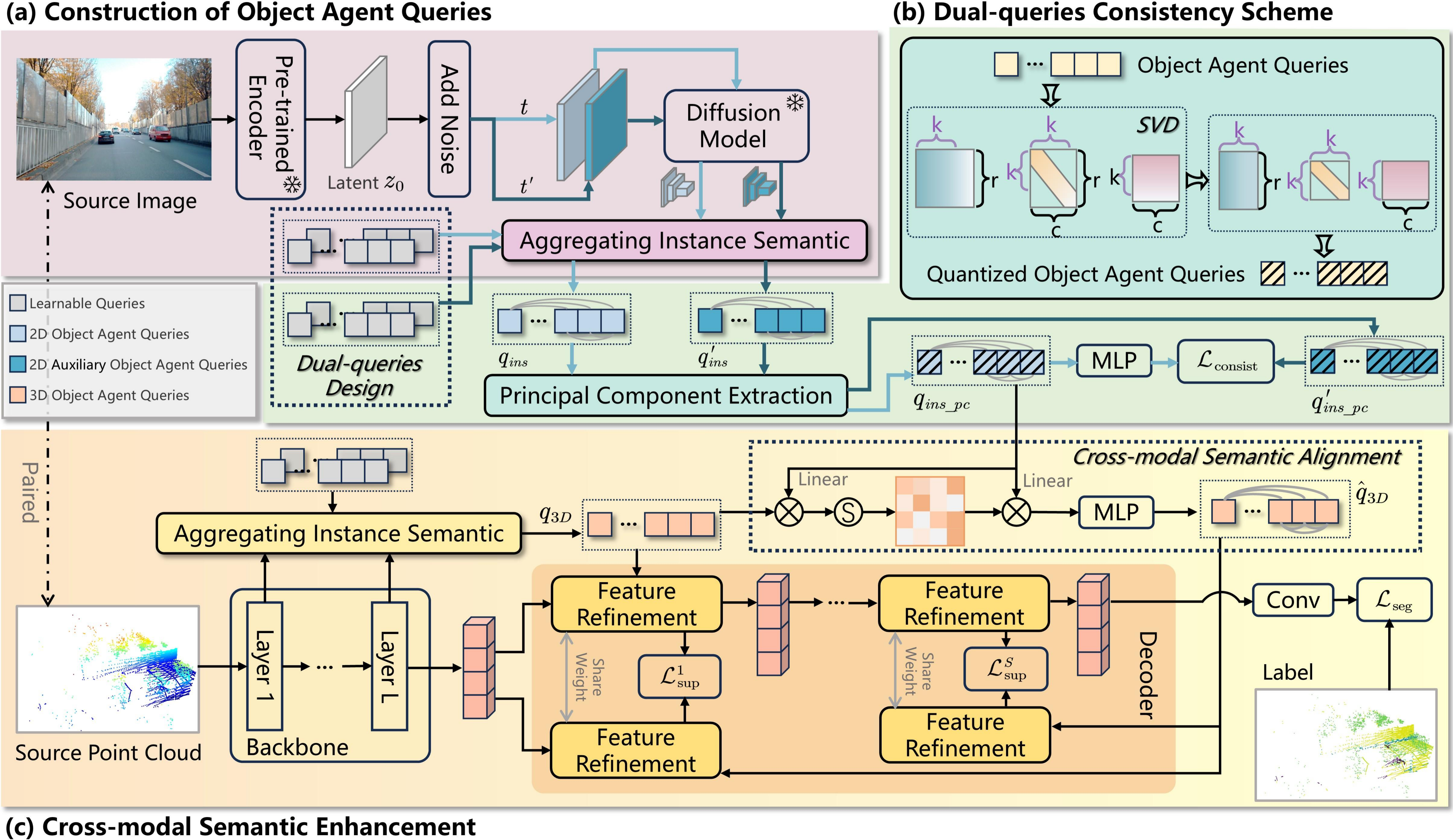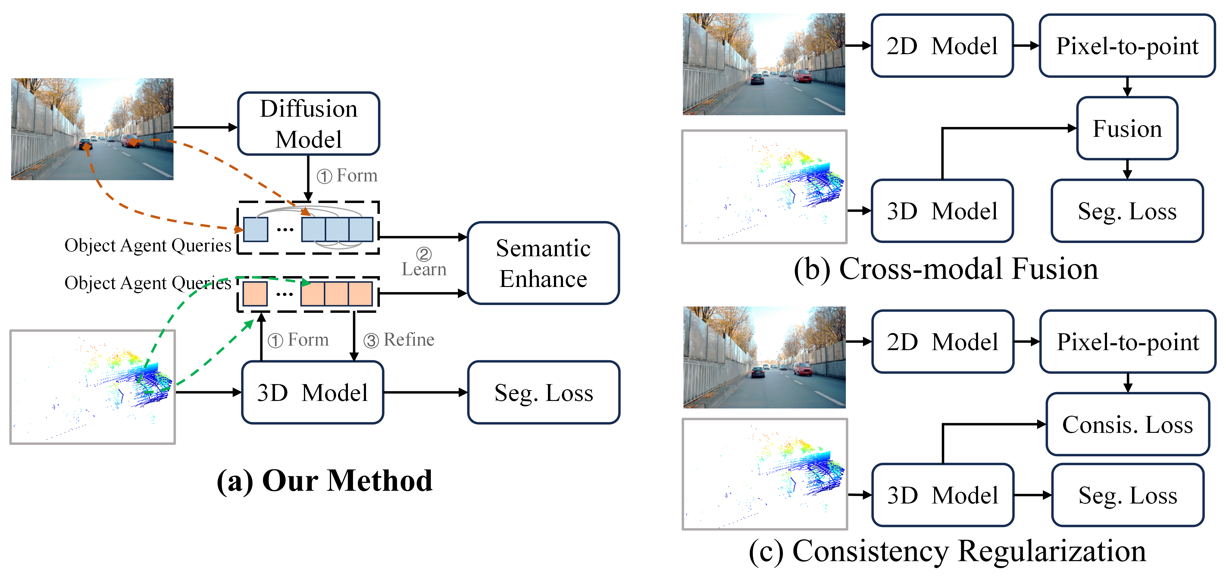Existing methods mainly adopt two paradigms: (a) consistency regularization, which enforces alignment across modalities, and (b) cross-modal feature fusion, which integrates multi-modal information. However, both paradigms focus primarily on individual domain-invariant features, overlooking rich semantic dependencies among objects. In contrast, our method (c) leverages object agent queries as an interface to incorporate instance semantic dependencies from diffusion priors into the 3D semantic space, enhancing cross-domain generalization of 3D semantic segmentation.