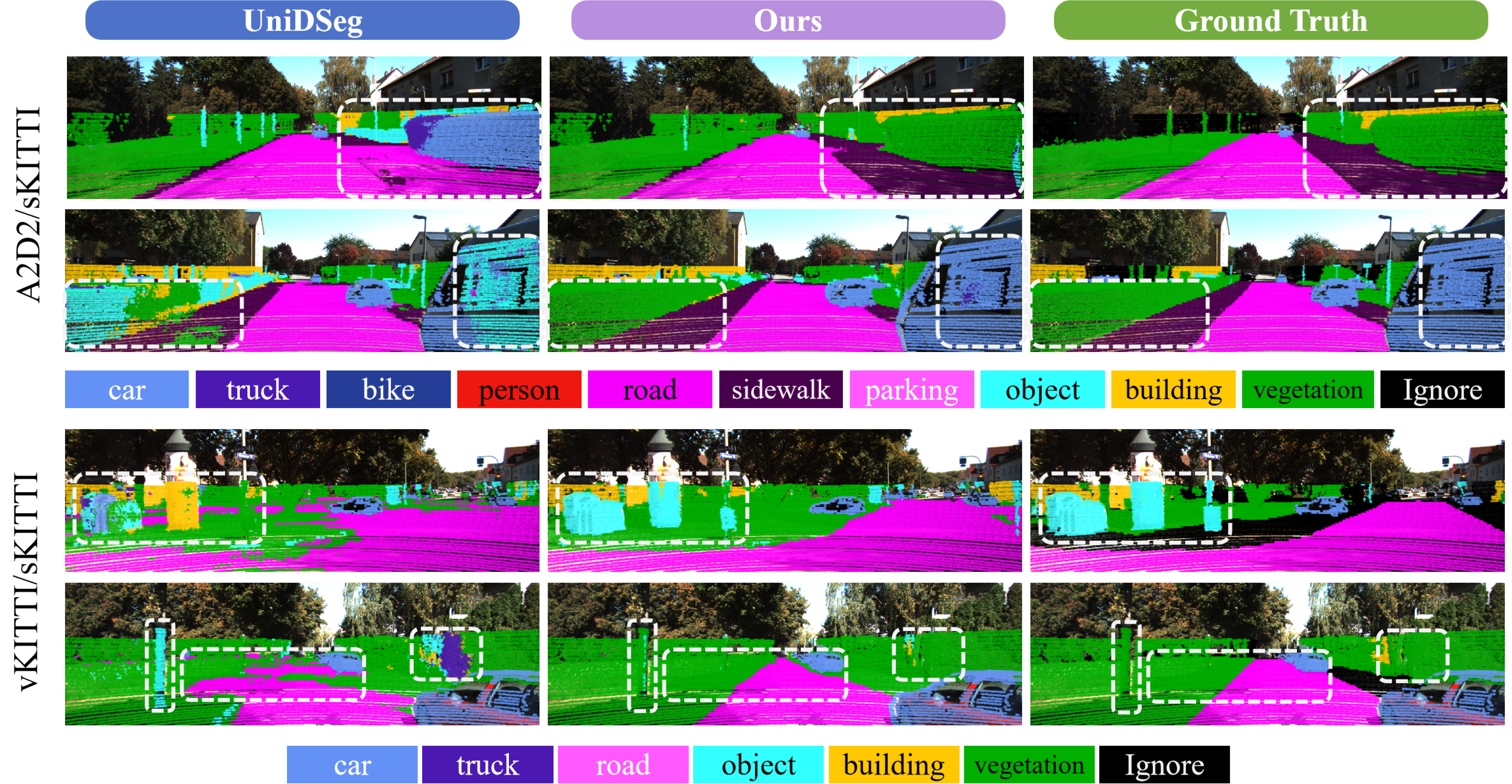 Qualitative results of DG3SS. From left to right: the visual results predicted by UniDSeg, Ours, and GroundTruth. We deploy the white dash boxes to highlight different prediction parts.