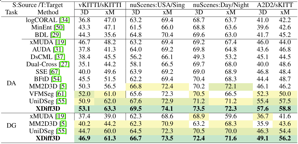 Performance comparison of domain adaptive and domain generalized 3D semantic segmentation methods in four typical settings. xM denotes the result which is obtained by taking the mean of the predicted 2D and 3D probabilities after softmax.