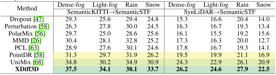 Comparison of previous domain generalization methods on SemanticKITTI→SemanticSTF and SynLiDAR→SemanticSTF benchmarks.